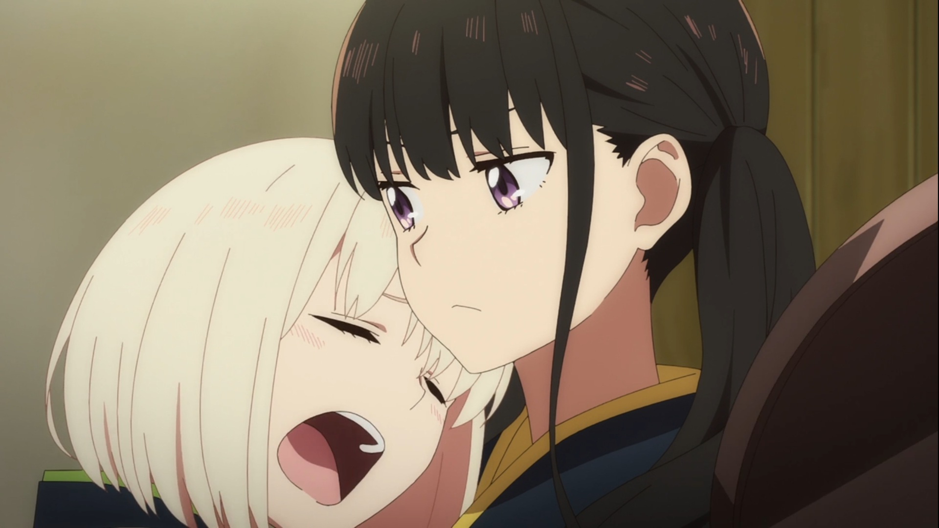 後輩に優しく射撃指導をするたきなは後ろから抱き締めるようにして銃の構えかたを教える