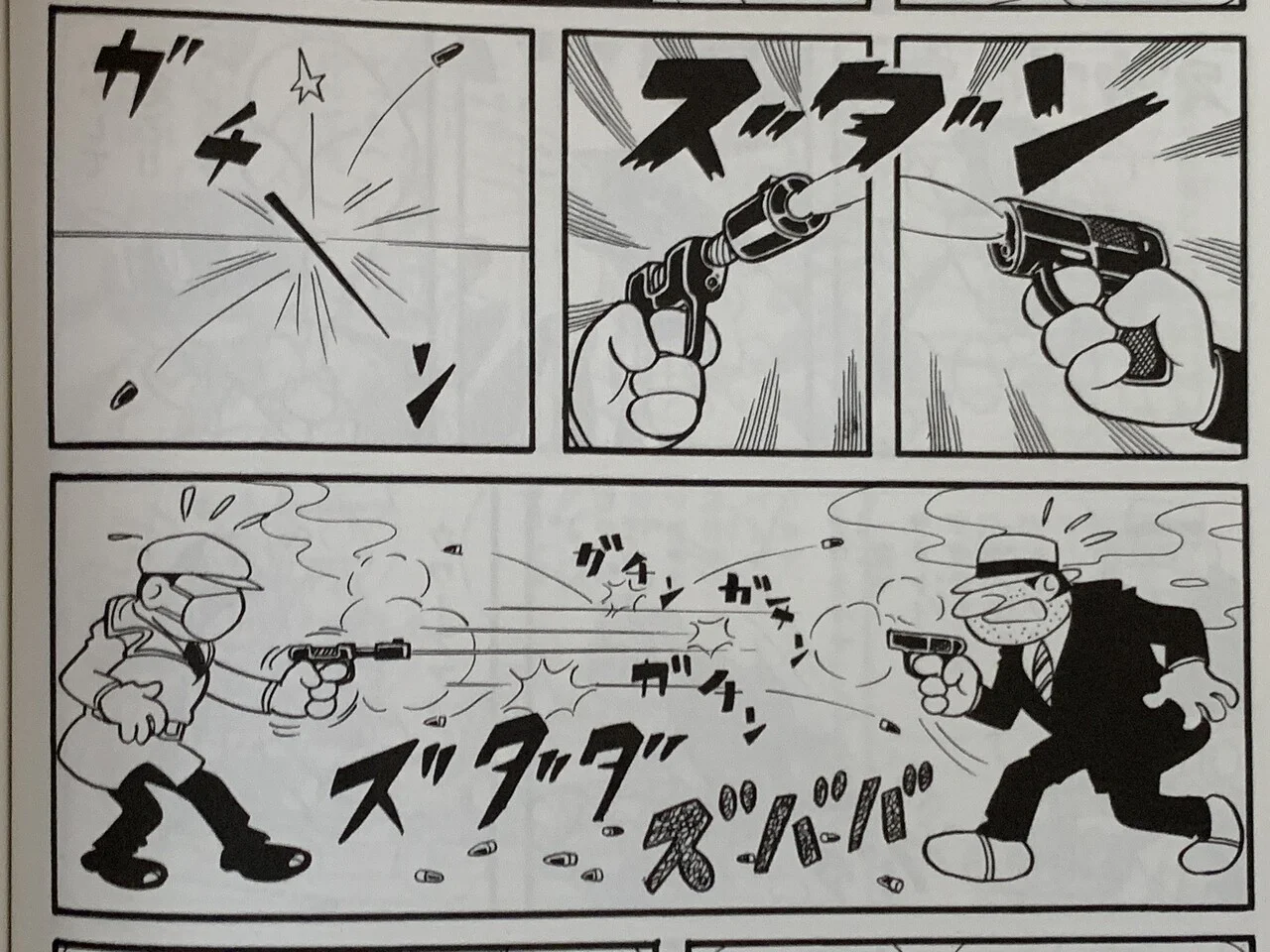 パーマンではスパイ同士が戦い、お互いに腕が良すぎて弾丸がぶつかり合うというギャグ描写がある。