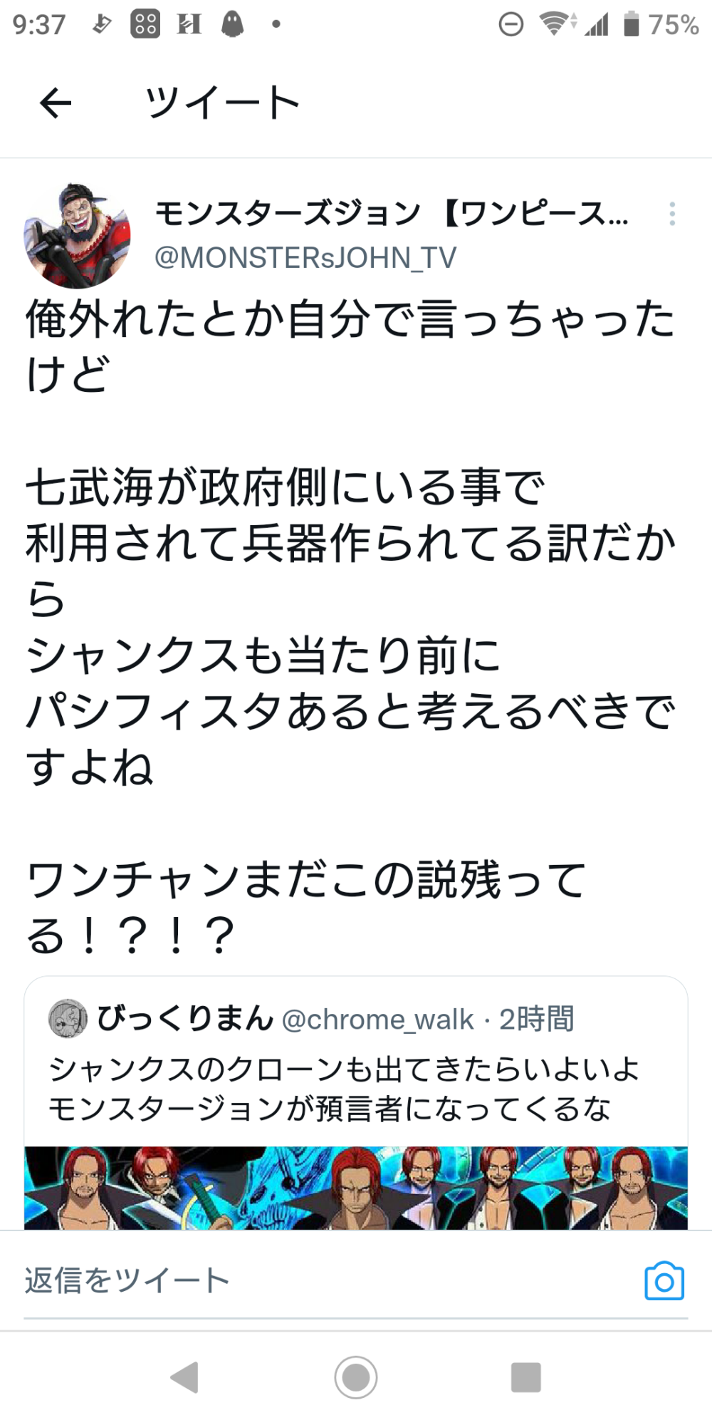 「くまが量産されてるんだから他の七武海が量産されてもおかしくない」なら至極真っ当な展開予想なんだけど(そしてドンピシャ)何故シャンクスの方に飛んでしまったのかw