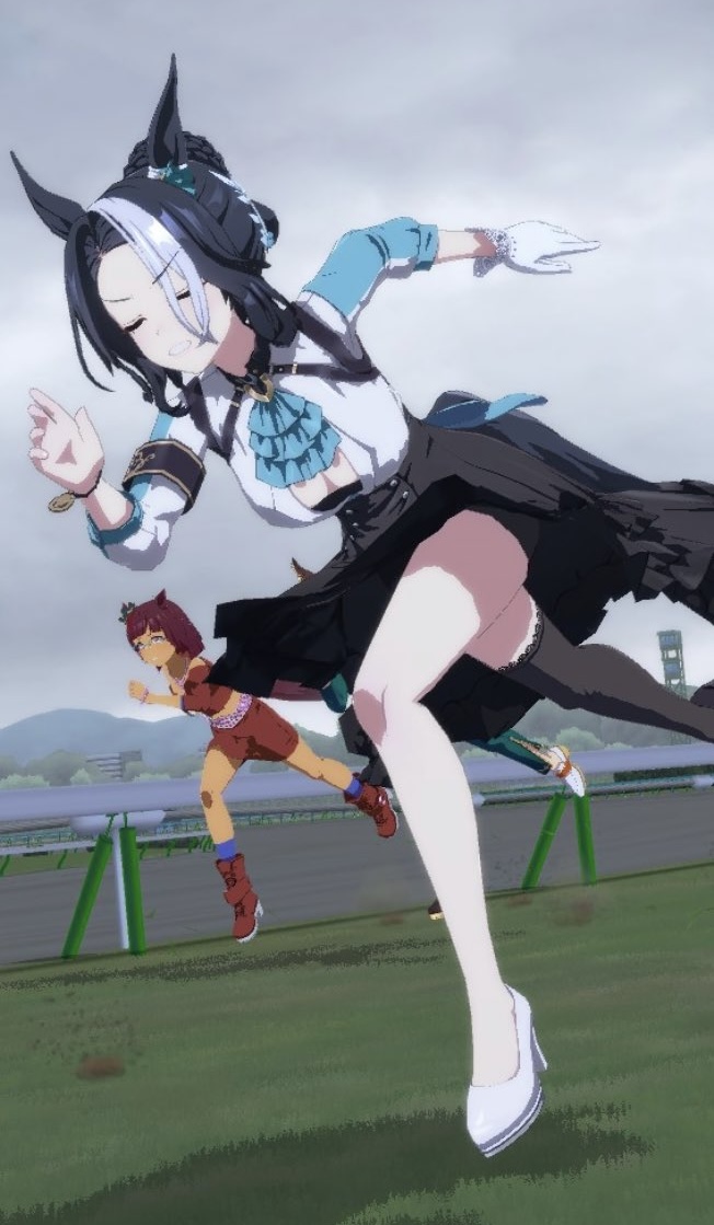 メタ的なこと言うとロングスカートだとポリゴン処理で走らせると変なことになるからせめて勝負服のスカートの前は短くしないと