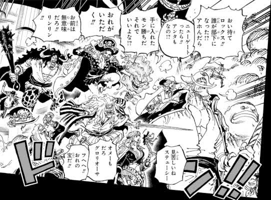 世界政府がマザーカルメルの仲介でやっと巨人山族を海兵として徴用できるようになったり、裏社会の者たちがシーザーに巨額の研究費を払って巨人化薬の生成を頼んだりしてる中で、新聞で近くの島で事件を起こしてるの知ったという理由で巨兵海賊団が助けに来てくれる麦わらの一味である