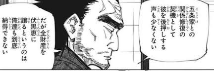 直毘人が帰ってマシに見えるレベルって相当だよな。加茂家もそうだけど呪術の家族はロクな奴がいないってはっきり分かるわ