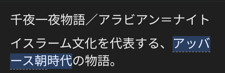 アラジンってアッバース朝時代の話らしくてそのアッバース朝時代は750〜1258年の話らしいのでウィッシュ(13世紀)と矛盾が生じるんだよな…