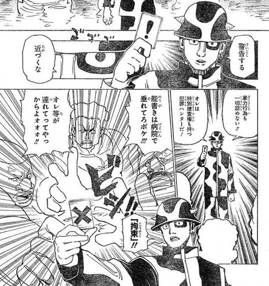 画像も出せないしうろ覚えだけど、法を破った相手にそれに応じた罰(その時は不法侵入に対して、強制退去だった筈)を与える念能力持ちがいたし、