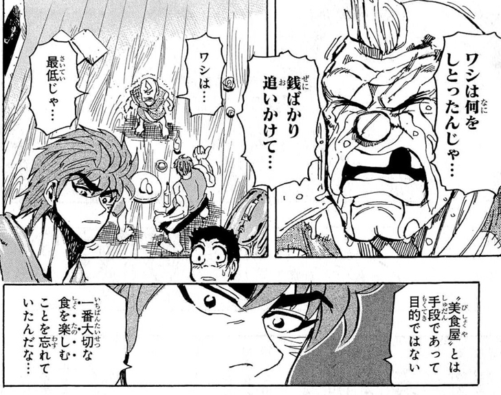 守銭奴に成り下がってしまった爺さんがトリコ達との食事で誰かと飯を分かち合う喜びを思い出す名シーンなんだけど大竹の過去とかトリコは失ってから初めて気がつく当たり前の大切さを説くエピソード多いよね