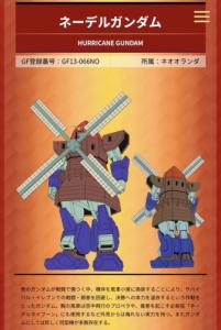 「他のガンダムが戦闘で傷つく中、機体を風車小屋に偽装することにより、サバイバル・イレブンでの戦闘・損害を回避し、決勝への体力を温存するという作戦をとったガンダム」