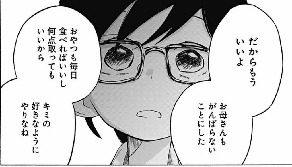 本編後に東兄弟がゲームしてて東くん母がパンケーキ出してるの見ると「お母さん頑張らない事にした。もう100点取らなくていいしパンケーキもお菓子も好きに食べなさい」を実行されてるのかなと思った