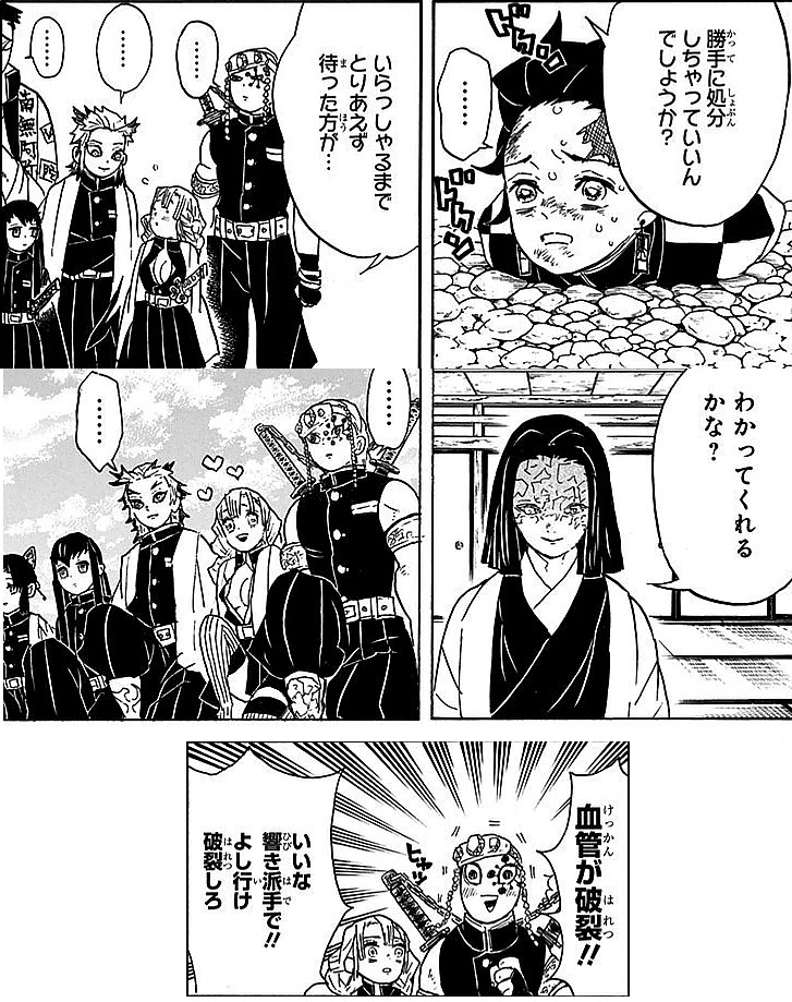 好意的に見ると、「他の柱が蛇柱を止める空気じゃない」っていうのを示して炭治郎がそのまま無理するとマジで血管破裂するぜって伝えてるともとれるから・・・まぁノリの可能性のがでかいけど