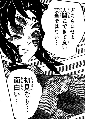 「雷の呼吸の剣士……最後に見せた型……見事、也……。故に……今際の際の、最期の言葉……聞いてやろう」