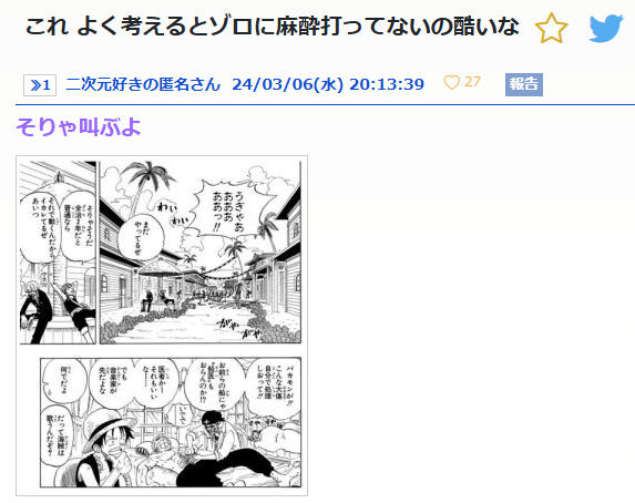 サムネは麻酔なしで縫われてるゾロもすごいけど、兄貴が痛みに呻いてる横でスヤスヤ寝てる舎弟2人もすごい