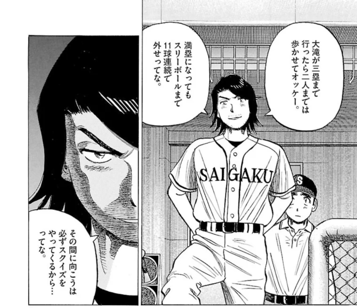 相手は”鈍足な山田を1番に、悪球打ちで真ん中を打てない岩鬼を4番にさせる”起用を狙ってたので大苦戦する羽目に