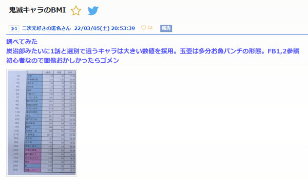 前に鬼滅キャラのBMIまとめてるスレあった気がすると想って探したらあった