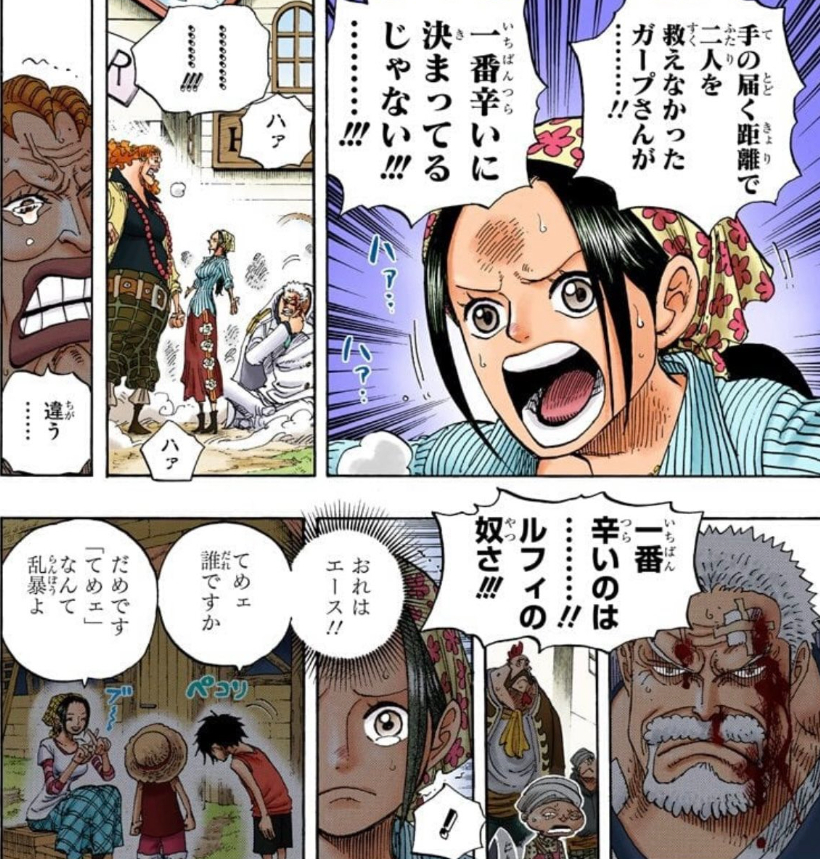 ダダンがガープに殴りかかったのを仲裁しようとしたマキノさんがエースを救えなかったガープさんが1番辛かった‼︎と庇うけど、それに対してダダンが「1番辛いのは……‼︎ルフィの奴さ!!!」って反論するシーン