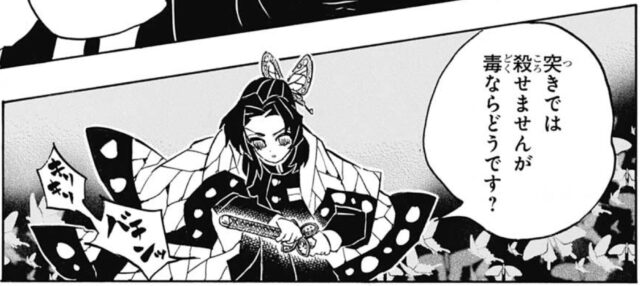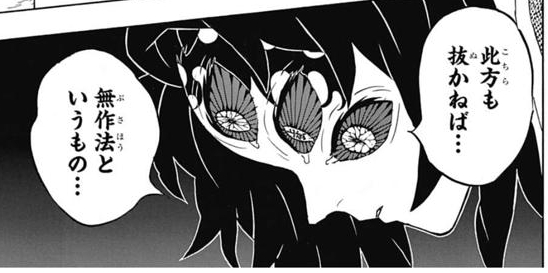 初撃は目玉からの突き上げで脳ちゃんと狙ったり、百足蛇腹で頸を狙う事で毒を効率的に与えようとしてたり、複眼六角で一般的に人体の弱点となりうる頭、心臓、レバー辺り狙ってたから覚悟は決めていたけど一生懸命生きようとしてたんだなぁって尊いねぇしのぶさん
