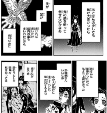 本人も生きて蝶屋敷に帰りたかったことは彼女の独白を見てもわかるけど、死力を尽くしても独力では童磨には勝てなかったのは残酷だよね・・・。